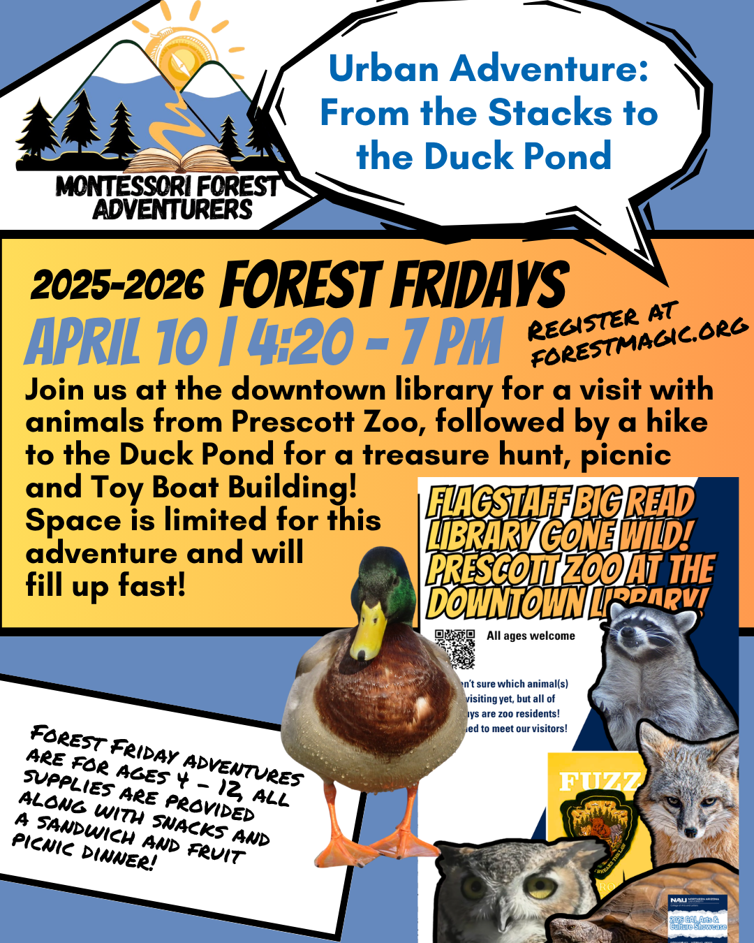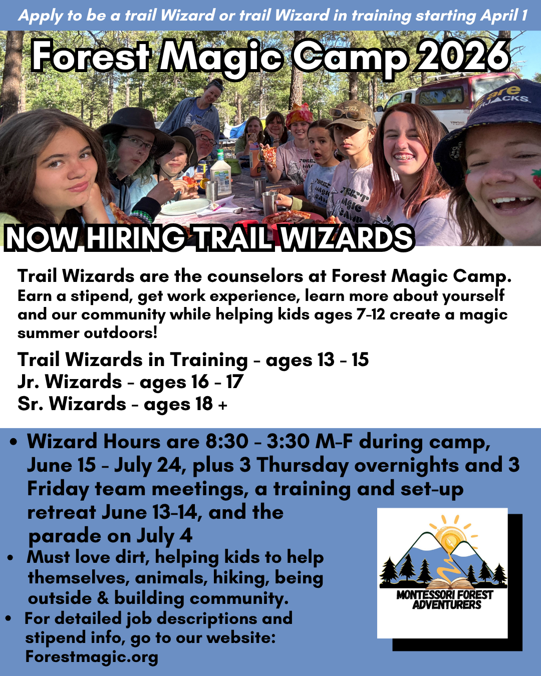 Montessori Forest Adventurers is a Non-Profit 501c3 located in Flagstaff, Arizona. We build community, confidence, and a love of the outdoors with children, youth and families.